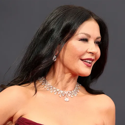 Кэтрин Зета-Джонс выбрала винную помаду — она делает это довольно успешно и часто. Хочется отметить, что актриса решила обойтись без плотного тона косметики. На ее лице хоть и не сильно, но видны пигментные пятна. И мы поддерживаем звезду в таком деликатном, но всё же публичном принятии своих возрастных изменений!
