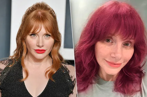 Еще один вариант разноцветного окрашивания — буйная фуксия от Брайс Даллас Ховард. Мы привыкли видеть актрису с медно-рыжими локонами, красной помадой и четкими темными стрелками. Новый образ стал противоположностью привычному: полное отсутствие макияжа глаз, нейтральный цвет губ и фантастический оттенок волос. Очень смелое заявление!