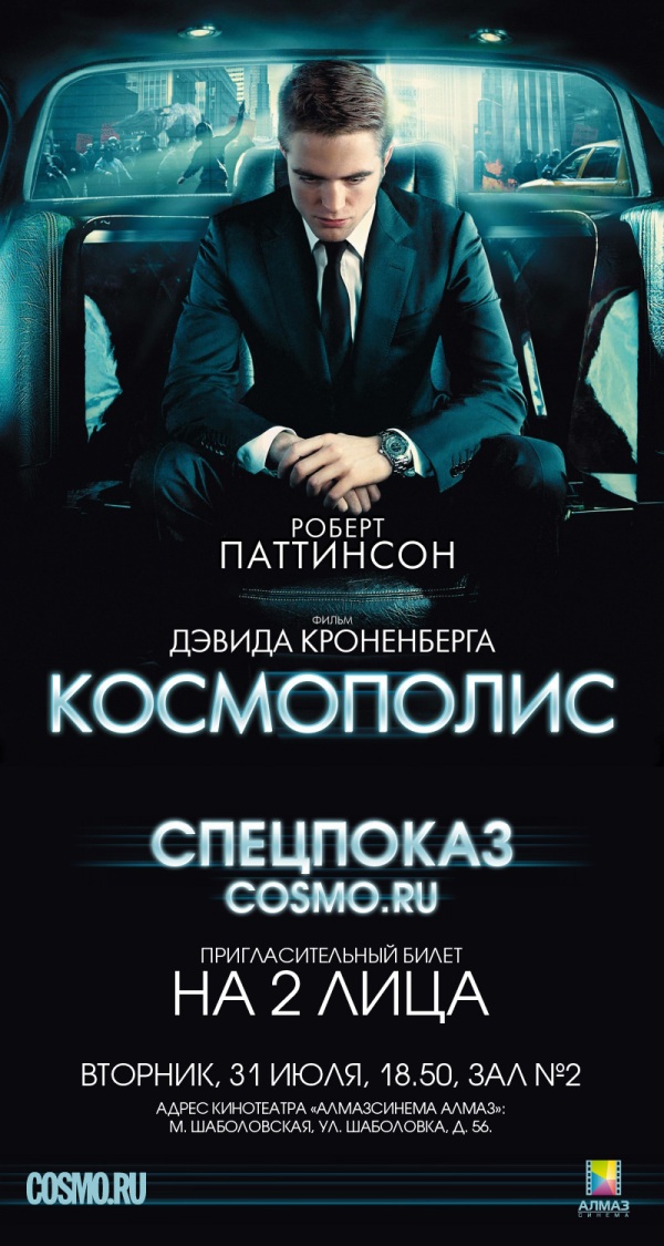 Сегодня мы хотим позвать тебя на специальный показ фильма «Космополис»! Хочешь провести два часа в компании Роберта Паттинсона? Ждешь заключительную серию «Сумерек»? Интересно посмотреть на очаровательного кровопийцу в новом образе?