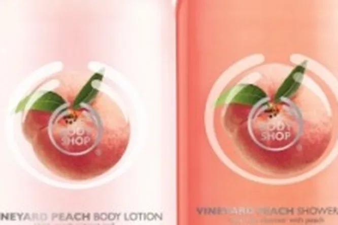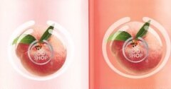 А наш следующий подарок - набор из двух средств от марки The Body Shop: гель для душа и лосьон для тела с ароматом персика.