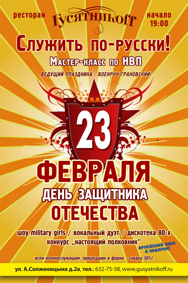 шоу — военрука Грановского! Не опоздай к параду, начало — в 19:00. Кстати, военнослужащим в форме будет оказана особая честь в виде 50% скидки. Приходите со своим Защитником и спешите соблюдать праздничную дисциплину — будет весело!
