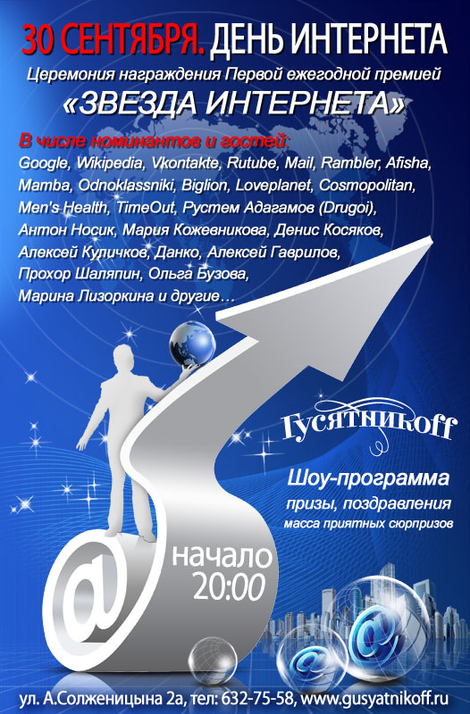 30 сентября 2011 года впервые в России в ресторанном комплексе «Гусятникоff» пройдет церемония награждения Первой ежегодной премией «ЗВЕЗДА ИНТЕРНЕТА», вручаемой за самые выдающиеся заслуги во Всемирной Сети.
