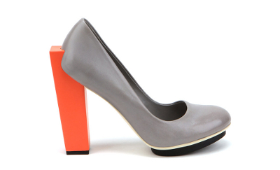 Серые туфли с необычным коралловым каблуком будут одинаково хорошо смотреться как с брюками, так и с юбками.