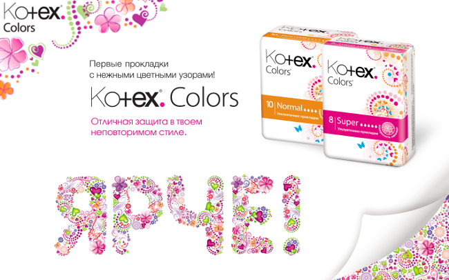 Первые и единственные прокладки с ярким цветным дизайном поднимают настроение и придают уверенность в себе, позволяют быть неотразимой не только на отдыхе, но и каждый день. Благодаря Kotex Colors предметы женской гигиены превращаются в стильный фешн-аксессуар — яркий и оригинальный.