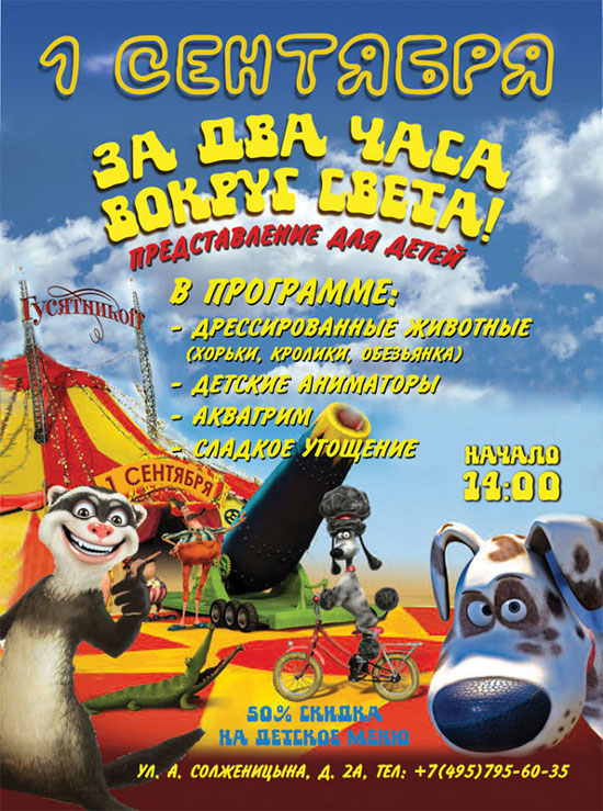 В День Знаний ресторан обещает массу веселья для всей семьи. Приходите к 14:00 и... не пугайтесь, если сразу же потеряете ребенка. Наверняка он уже будет играть с дрессированными кроликами, хорьками и обезьянкой! Конечно же, под присмотром. Пока вы наслаждаетесь изысканным меню, «молодежь» опекают веселые аниматоры.
