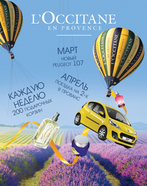 Этой весной компания Л’Окситан дарит всем своим покупателям возможность выиграть новую модель Peugeot 107 в марте, поездку в Прованс для двоих в апреле и более 200 подарочных корзин с продукцией Л’Окситан еженедельно.