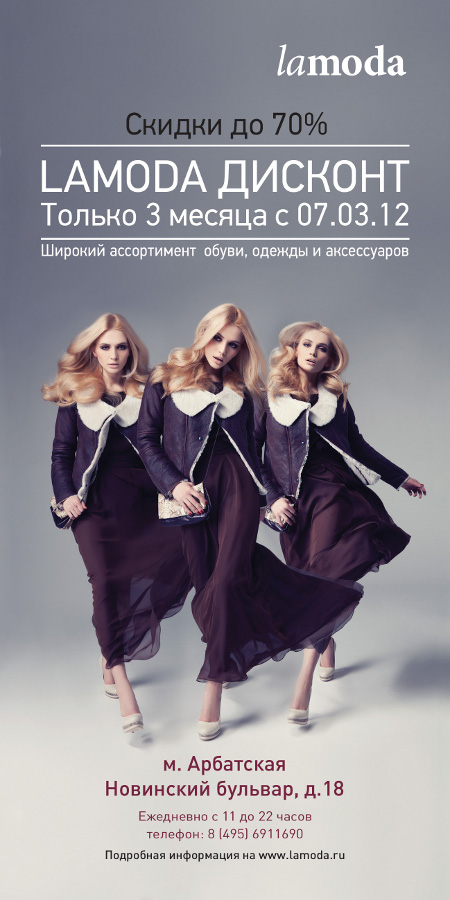 Магазин открыл двери первым покупателям 7 марта в 15.00. Так что уже можно смело ставить себе в планы посещение этого приятного во всех отношениях места. Тем более что только в течение трех месяцев клиенты Lamoda Дисконта могут приобрести одежду и обувь более 30 известных марок со скидкой до 70%.