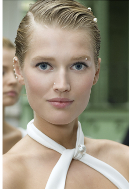 На свечение и чистоту с легким прикосновением юмора. Кожу моделей я сделал бледной, но светящейся с легким розовым или коралловым румянцем. Тени Illusion d’Ombre я нанес на подвижное веко, чтобы создать эффект влажных век, а потом провел тонкие линии подводкой черного цвета вдоль линии роста ресниц. Образ завершили слегка глянцевые губы и произвольно прикрепленный «пирсинг» из жемчуга.