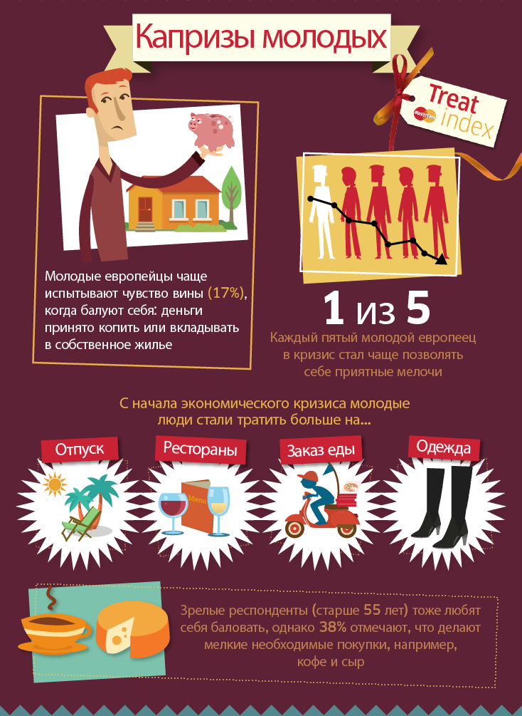 Хотя молодые люди чаще остальных чувствуют вину за то, что расходуют средства на себя, отчет показал, что они также наиболее склонны к подобным тратам. Вдобавок к тому, что каждый пятый (20%) опрошенный представитель молодого поколения признал, что с начала финансового кризиса стал чаще позволять себе приятные мелочи, молодые покупатели также тратят больше денег на крупные приобретения и предметы роскоши. Почти треть (29,7%) покупателей из этой категории с начала кризиса стала расходовать больше средств на отпуска, еду в ресторанах и кафе, одежду и аксессуары. Для сравнения: более зрелые респонденты (55 лет и старше) по-прежнему любят себя побаловать, однако 38% отмечают, что чаще делают мелкие покупки, которые считаются необходимыми — например, кофе и сыр.