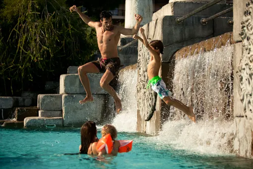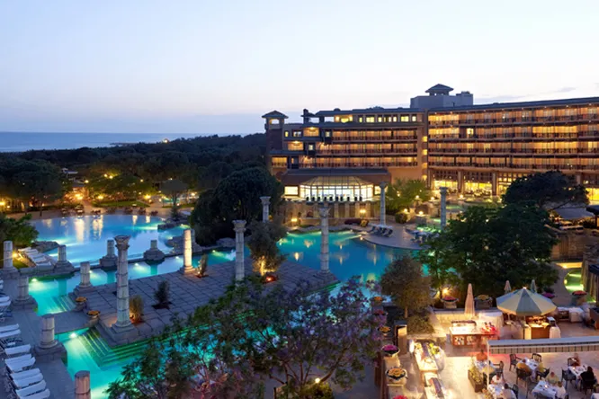Его архитектура отсылает к временам античности, полукилометровый пляж отмечен «голубым флагом» — международным знаком качества, а территория напоминает райский сад. По сути, это полноценная лесопарковая зона, в которую органично вписались жилые здания, бассейны, аквапарк, SPA-центр и множество инфраструктурных объектов.