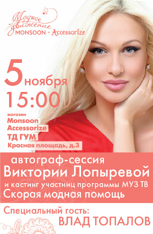5 ноября в 15.00 в магазине Monsoon Accessorize в ТД ГУМе состоится автограф сессия популярной телеведущей, фотомодели, Мисс России — Виктории Лопыревой. Виктория поддерживает Модное движение Monsoon Accessorize и на встрече с поклонниками сама выберет участницу следующей программы МУЗ тв «Скорая модная помощь». Специальный гость мероприятия — Влад Топалов. Приходите и сами все увидите!