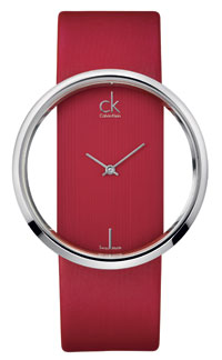 Его бесконечное движение заключено в лаконичной форме: полированная нержавеющая сталь циферблата, пролегающая под стеклом, продолжает свою линию в ремешке светло-серого или бежевого атласа, в белой или черной коже. Алый атлас – еще один вариант, по-новому раскрывающий смысл коллекции ck Glam.