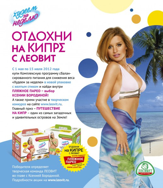 При покупке любой низкокалорийной программы «Худеем за неделю» со специальным желтым стикером «Отдохни на Кипре с ЛЕОВИТ» вы получаете в подарок пляжное парео, а также купон, на который нанесен уникальный номер. Номер необходимо зарегистрировать на сайте «ЛЕОВИТ» в Интернете и прислать свою фотографию на тему «Как я похудел с ЛЕОВИТ».