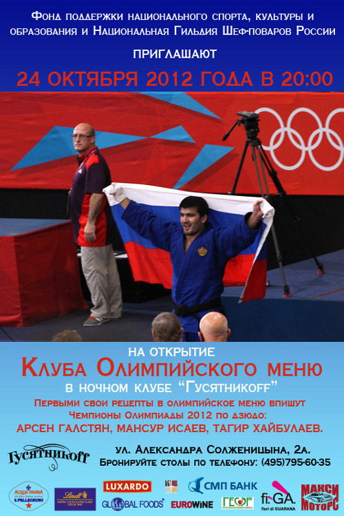 24 октября в 20.00 в ресторанном комплексе три олимпийских чемпиона по дзюдо будут состязаться не за спортивные регалии, а за лучший рецепт. А. Галстян, М. Исаев и Т. Хайбулаев попробуют сравниться с легендарным поваром из древней Эллады. Оценивать их мастерство будет именитое жюри, которое возглавит президент Гильдии Шеф-поваров России А. Н. Филин. Совместными усилиями мастера кулинарии и спорта составят специальное олимпийское меню (блюда из которого смогут бесплатно попробовать участники Олимпийских и Параолимпийских игр).