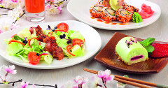 • Если после работы ты добираешься до дома примерно к семи часам, ограничивайся свежевыжатыми соками, легкими салатами или кисломолочными продуктами до 4% жирности. Пусть в твоем позднем ужине доминируют продукты, богатые белком (птица, рыба, морепродукты). Здесь идеальным решением будут блюда из специального меню «Весеннее Обновление»: салат «Хиоки сан Сяке» с лососем, томатами и свежими листьями салата под имбирно-морковным соусом и роллы «Миэ Магуро Сякэ» с лососем и тунцом с кусочками свежего огурца и зелёного лука.
