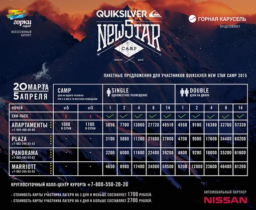 В специальные дни можно будет протестировать новый внедорожник Nissan X-Trail, а в дни, когда по погодным условиям не будет работать подъемник, все участники лагеря смогут посетить аквапарк Mountain Beach c настоящим морским песком и площадкой для пляжного волейбола бесплатно! Все активности на лагере, в том числе вечеринки, будут доступны только по карте участника Quiksilver New Star Camp.