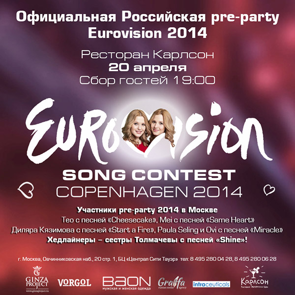 Впервые за всю историю российских pre-party на вечеринке выступит рекордное количество участников «Евровидения-2014» из других стран. Санна Нильсен из Швеции с песней «Undo», Тео из Белоруссии с песней «Cheesecake», Диляра Кязимова из Азейрбайджана с песней «Start a Fire» и многие другие! Гостей летней веранды ресторана «Карлсон» ждет не только зажигательный концерт, но и великолепный вид вечерней Москвы.