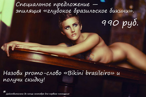 Специальное предложение— эпиляция «глубокое бразильское бикини». Подойдет для тех, кто собирается танцевать на карнавале или... щеголять перед любимым в тончайших стрингах. Он обязательно оценит твою упругую и гладкую попку! Вся процедура занимает 10 минут. При записи к мастеру до конца сентября у тебя есть уникальный шанс сделать процедуру со скидкой, просто назови promo-слово «Bikini brasileiro» и наслаждайся!