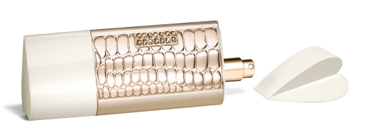 Лишенный углов, флакон удобно лежит в руке и по форме напоминает сердце — один из любимых мотивов бренда Swarovski. Внимание привлекает смелое сочетание фактур: отполированный фон цвета слоновой кости и вставка, тисненная под кожу крокодила.