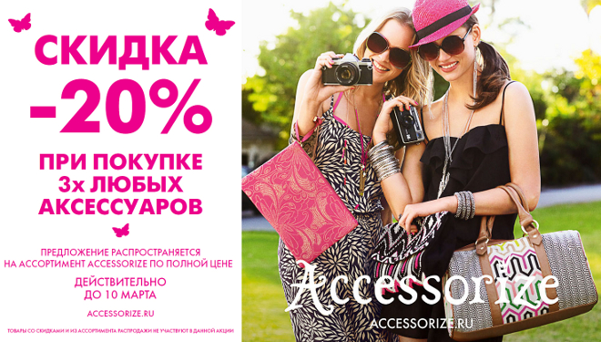 Весенней акцией встречает своих покупательниц сеть магазинов Accessorize! Только до 10 марта при покупке любых 3-х аксессуаров вы получите приятную скидку 20%!