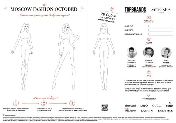 Слоган конкурса — «Аппетит приходит во время игры». Почему? С 7 октября в ресторане «Москва» (Санкт-Петербург) тебе предложат поиграть, пока ты ожидаешь заказ. На любом столике в ресторане ты найдешь бланк с женскими силуэтами. Нарисуй на них свой эскиз одежды и отдай официанту. Дизайнер Кирилл Гасилин, TOPBRANDS и Ginza project выберут три лучших образа. Имена счастливчиков будут объявлены в ноябре.