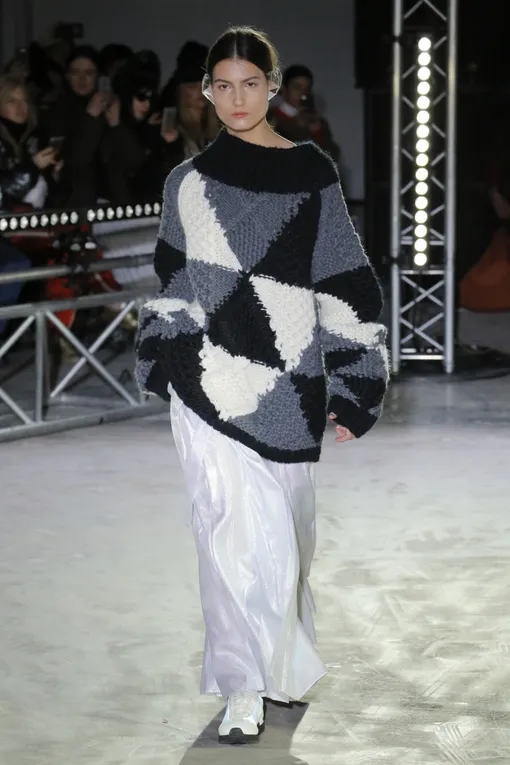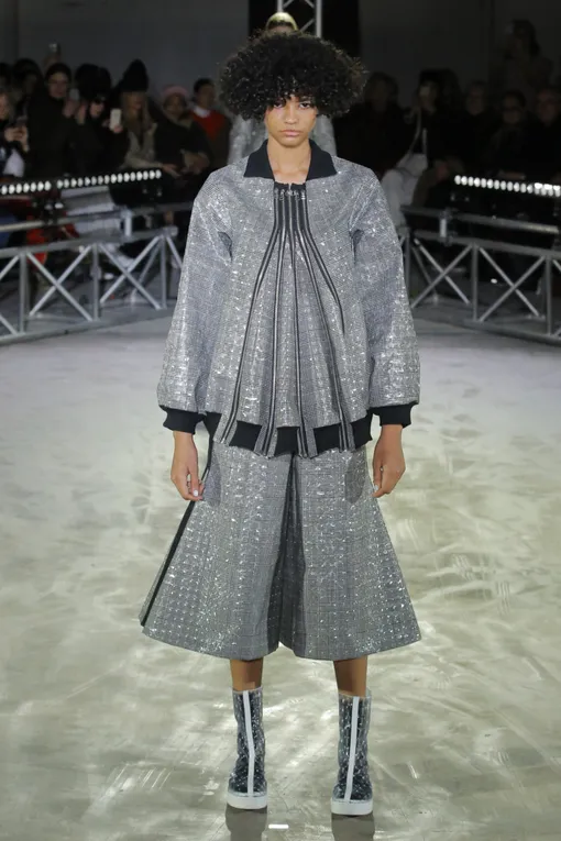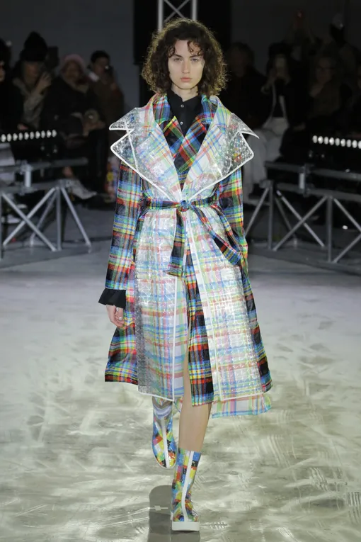 Каждый зритель показа видел образ со своего места, соответственно, одежда из ПВХ выглядела разноцветной под разными углами. Это не только красиво, но и отражает философскую коннотацию коллекции — каждый человек имеет право на свою точку зрения. (Другую концептуальную особенность пластика — способность выглядеть иначе на фотографиях — обыграл в кутюрной коллекции Maison Margiela.)
