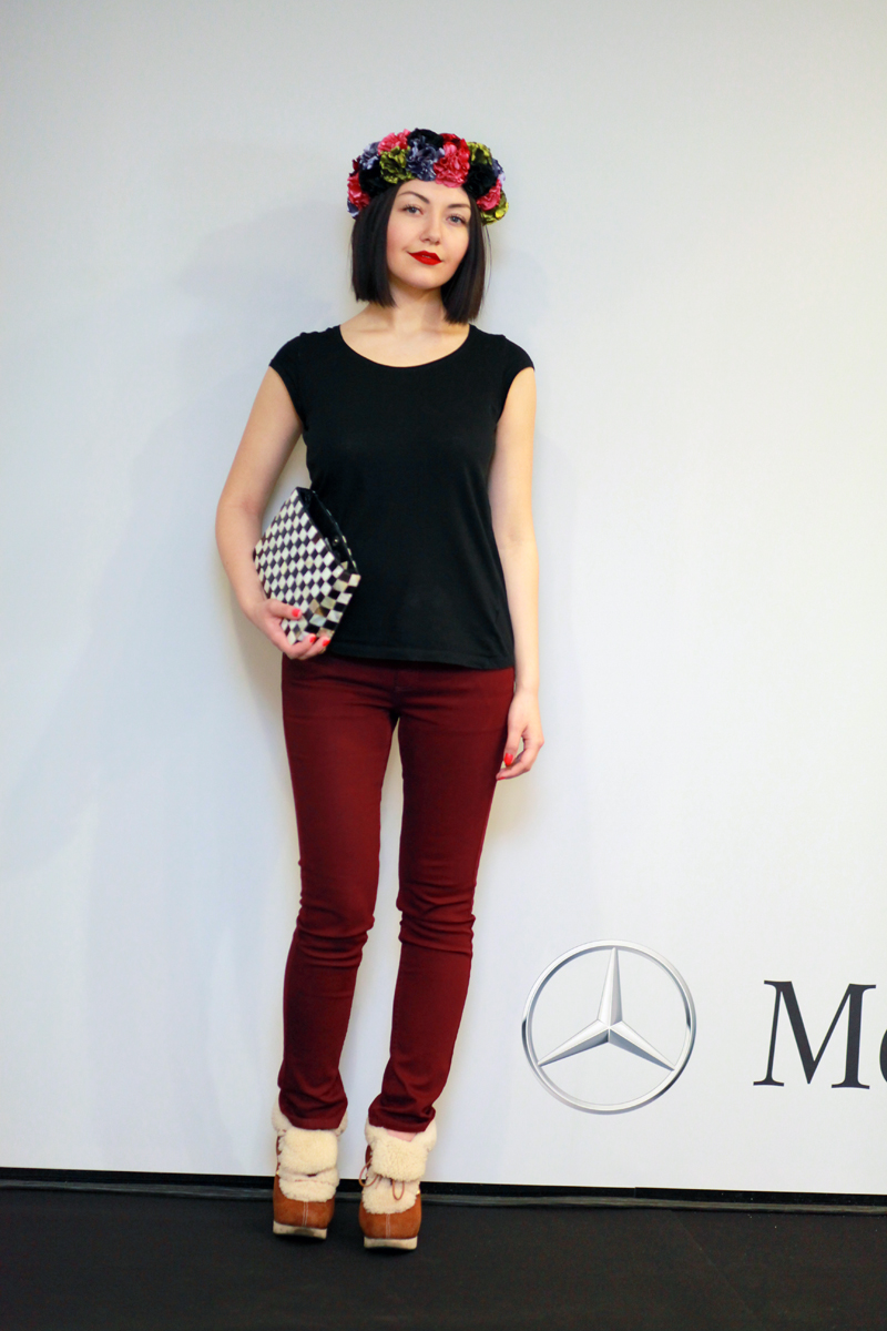 Плотные джинсы и теплые ботинки утяжеляют, являясь зимним образом. В данной ситуации идеально бы выглядела красная юбка в пол и легкие открытые туфли на шпильке или без.