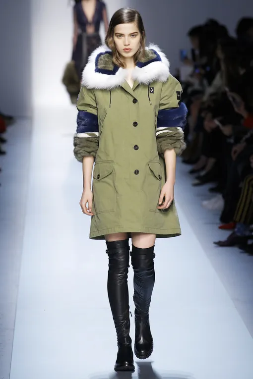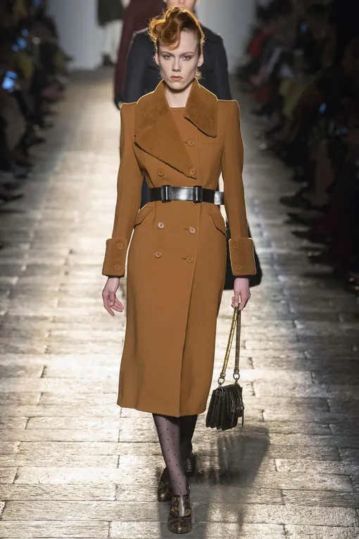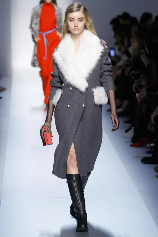Для тех, кто не очень привык экспериментировать с силуэтами, в Ermanno Scervino сделали вот эту модель пальто - очень женственную, мягкую и обволакивающую. Несмотря на двубортный фасон и объемные меховые карманы, градус женственности настолько зашкаливает, что носить это пальто можно даже с грубыми солдатскими сапогами — и все равно будет образ femme fatale.