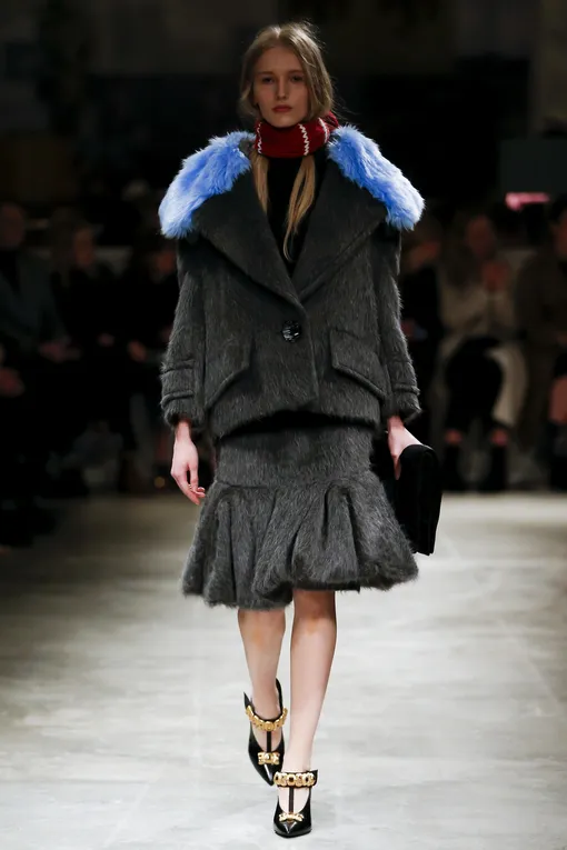 Плотное серое полупальто от Prada выигрывает не только за счет oversize-посадки, но и благодаря ироничному голубому воротнику, разбивающему всю серьезность серого комплекта. Носить подобные вещи предлагается, как на показе, с полосатыми шарфами в стиле преппи.