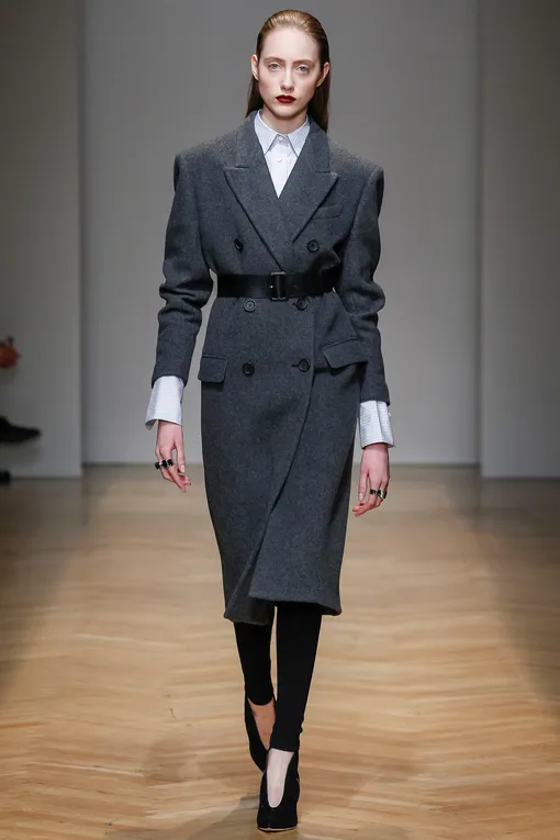 Пальто с «уверенным» плечевым поясом? Почему нет! Ищем модель как на показе Aquilano.Rimondi и подпоясываемся ремнем, обозначая талию. Носить можно с узкими брюками, в том числе и со штрипками.