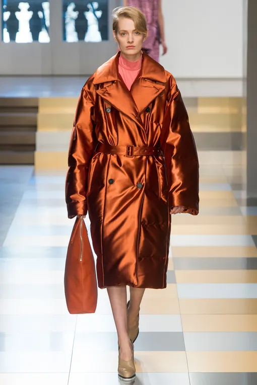 На вопрос о том, будут ли актуальны следующей осенью и зимой пуховики, в Jil Sander отвечают утвердительно: будут. И шьют пальто из переливающихся футуристических тканей.