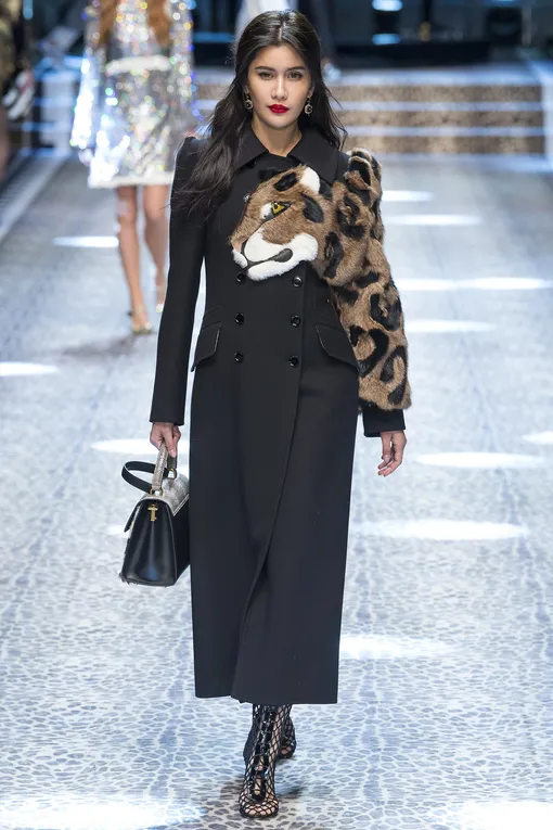 Двубортное черное пальто с меховым леопардом, вырастающим из рукава, сочетает в себе строгость и некоторую иронию. Ну и если уж заигрывать с анималистическими мотивами, то точно по сценарию Dolce & Gabbana.