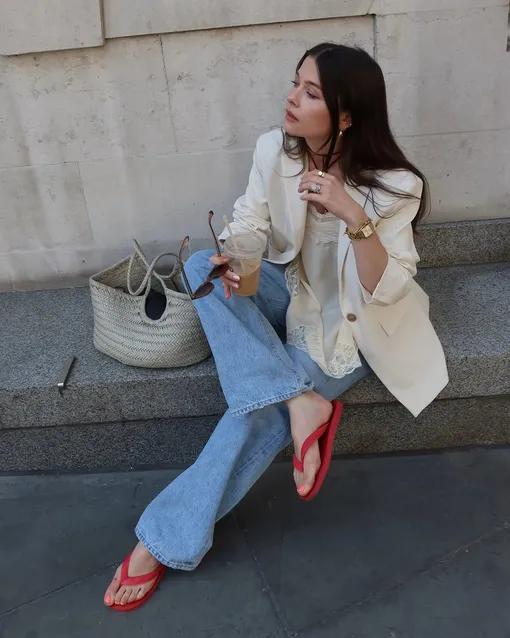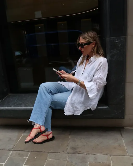 Простота здесь — главный козырь. Классические джинсы, льняная рубашка свободного кроя и удобные босоножки создают тот самый баланс между непринужденностью и продуманностью, который мы все ищем. Такой комплект хорош тем, что выглядит уместно в любой ситуации — идешь ли ты за утренним кофе или спешишь на встречу после работы.