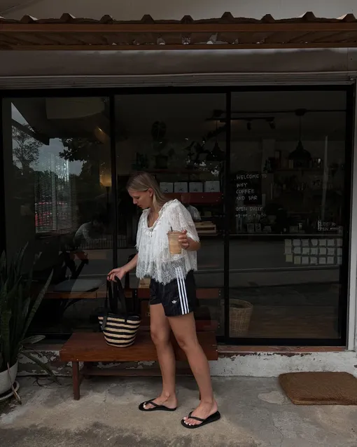 Если ты любишь спортивный стиль, но не хочешь выглядеть, будто только вернулась с пробежки, присмотрись к комбо спортивных шортов и воздушной блузы. Получается одновременно удобно и стильно — будто ты вообще не старалась выглядеть идеально, но у тебя все само-собой получилось.