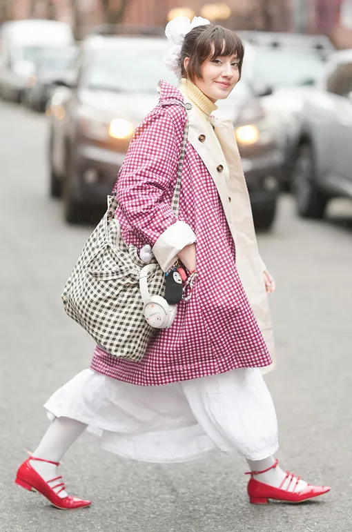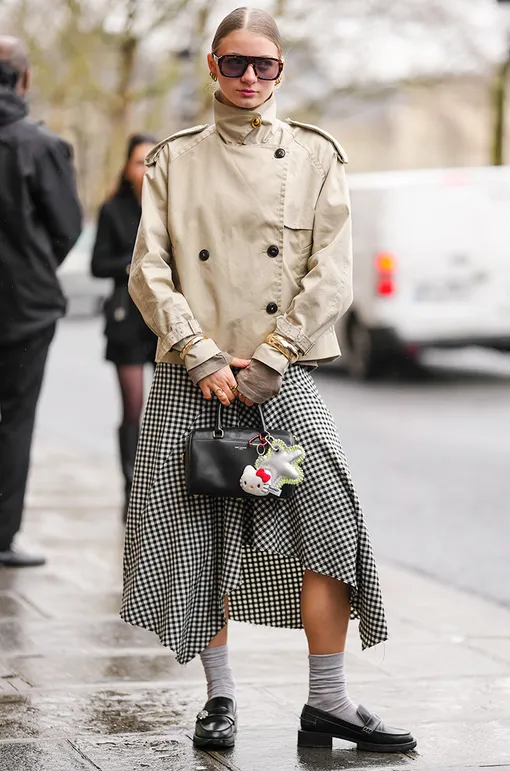 Да-да, стритайлеры до последнего выгуливают брюки-аладдины, миксуя их с тренчами в модную клетку виши. Кукольную эстетику поддержат туфли мэри джейн или те же лоферы с высокими носками.