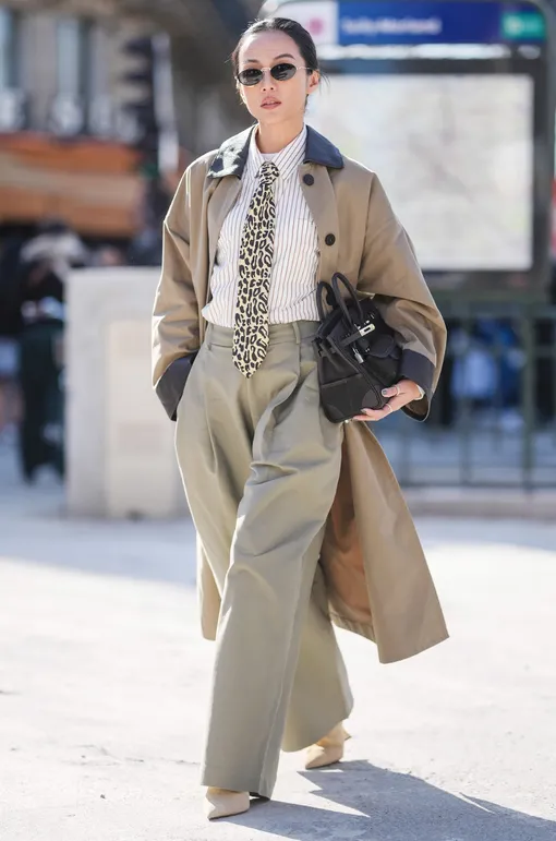 Рубашка, костюмные палаццо и тренч – сочетание, казалось бы, простейшее. Но как оно трансформируется, когда мы добавляем галстук! И не какой-то, а акцентный – в этом случае леопардовый принт пришелся как нельзя кстати.