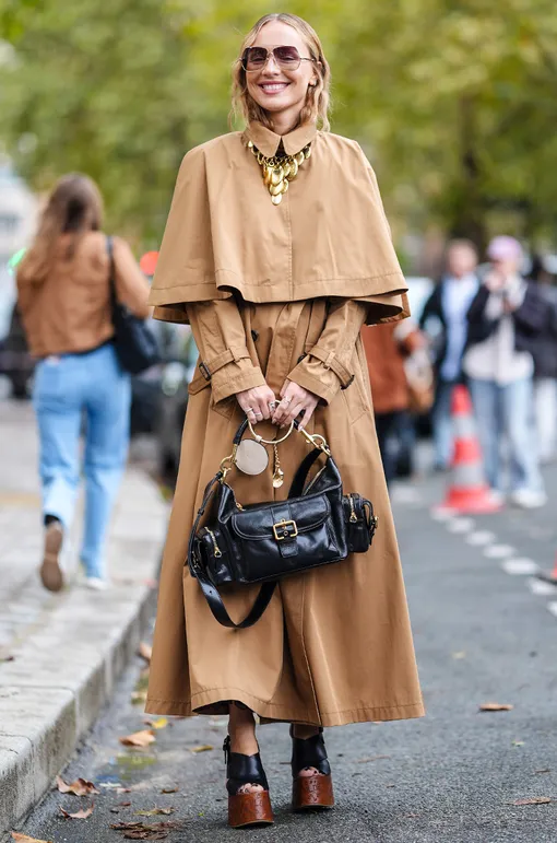 Тренчи с кейпом появляются на подиумах и стритстайлах все чаще, стало быть, к ним пора всерьез приглядеться. Хотя бы ради вот такого аутфита с акцентным колье, которое застегивается прямо под ворот плаща.
