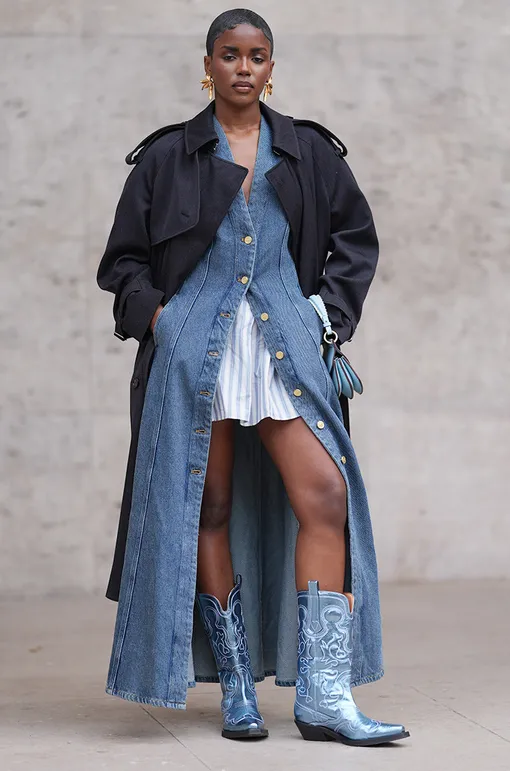 Джинсовое платье-рубашка, кажется, становится нашим фаворотом. Этот look с черным тренчем – мы впечатлены! Мини-юбку, выглядывающую из-под джинсового платья, можно заменить на «пижамные» шорты в полоску или шорты-баллоны, а вот казаки пусть остаются – отличное комбо.