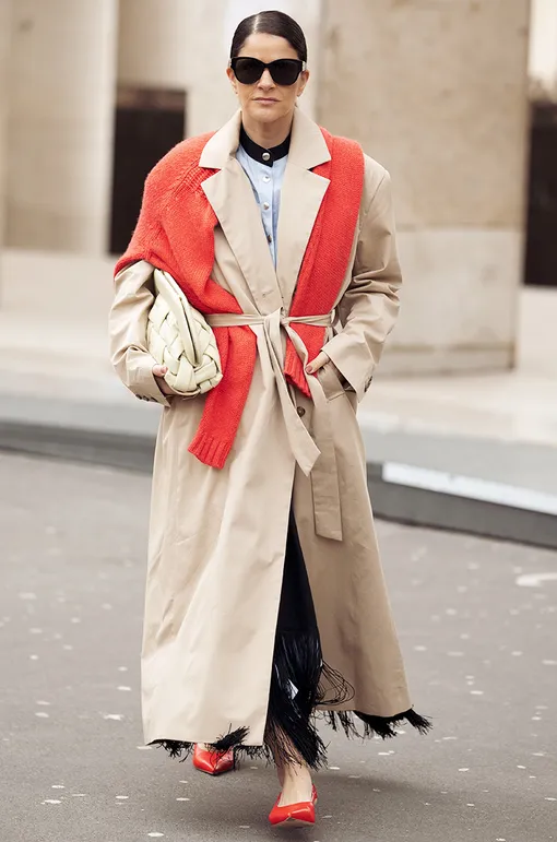 Этот старый как мир стайлинг-трюк – наброшенный на плечи свитер – всегда спасает положение. Яркий контрастный джемпер здорово освежает нейтральный тренч и создает дополнительный согревающий слой. Одни плюсы!