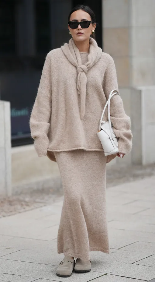 Не хочешь отказываться зимой от чувственных женственных образов? Самое время обратить внимание на трикотажные костюмы с юбками-макси. Из повседневного в вечерний такой образ легко превратить за счет акцентных украшений и изящной обуви на каблуке.