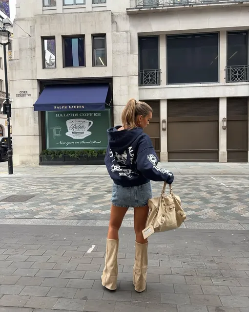 Самым актуальным модным комбо станет микро-юбка с удлиненным свитером, байкерскими сапогами и шерстяным пальто. Дополни look объемной сумкой-тоутом с минималистичным дизайном – и не забудь про аксессуары! Массивные, серьги (например, клипсы, кольца, каффы) классно впишутся.