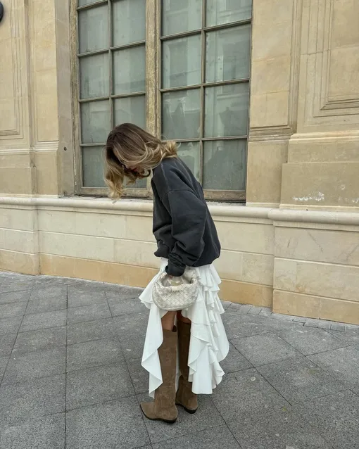 Сочетай грубые сапоги с двойным голенищем и мини-юбку из воздушного тюля или шифона, весной они будут в тренде. Мы бы добавили в образ косуху – крутое дополнение. В общем, вариантов для стилизации юбки и сапог в этом сезоне масса! Сохрани наши идеи в закладки, выдохни и реши, с какого look'а начать. Но не откладывай эксперименты надолго — весна уже наступает на пятки!