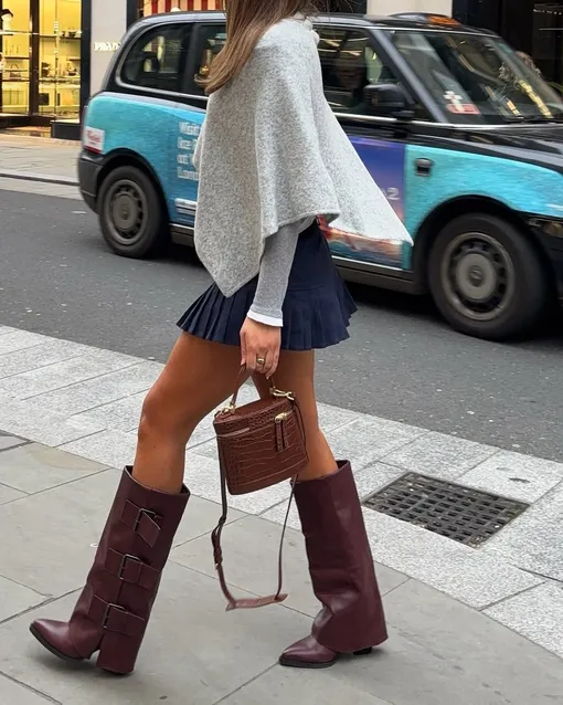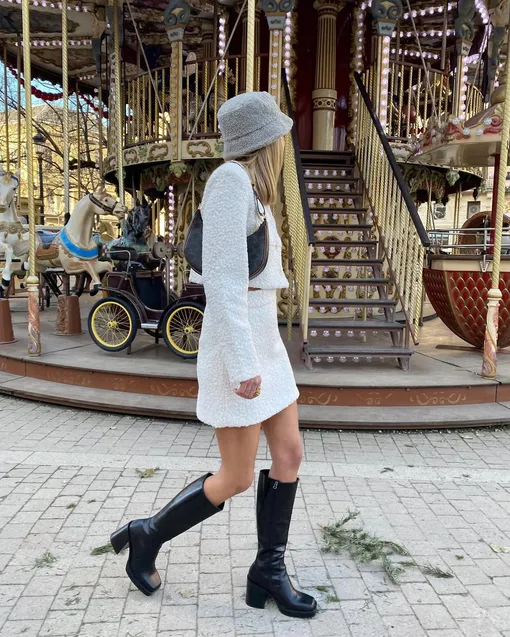 Образ, который можно смело завещать потомкам вместе с фамильным серебром. Шутим, конечно, но чего не отнять, того не отнять: мини-юбка из букле, твида, шерсти или другого плотного материала здорово смотрится с минималистичными кожаными сапогами. В том числе на удобном массивном каблуке.