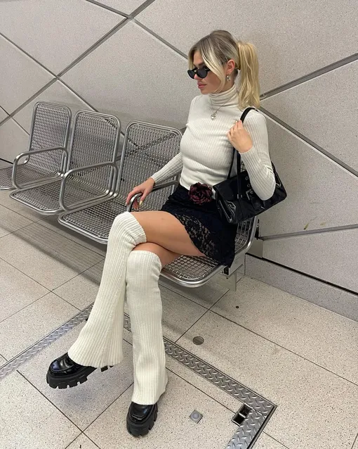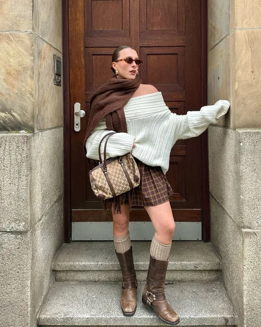 В этом сезоне байкерские сапоги носят с мини (и даже микро) юбками — например, моделями в складку или баллонами. В блогах модных инфлюенсеров была замечена рубрика «сапоги + гольфы» – проще говоря, фэшэниста чаще всего носят короткие юбки с байерскими сапогами и высокими гольфами. Бери на заметку готовый комплект.