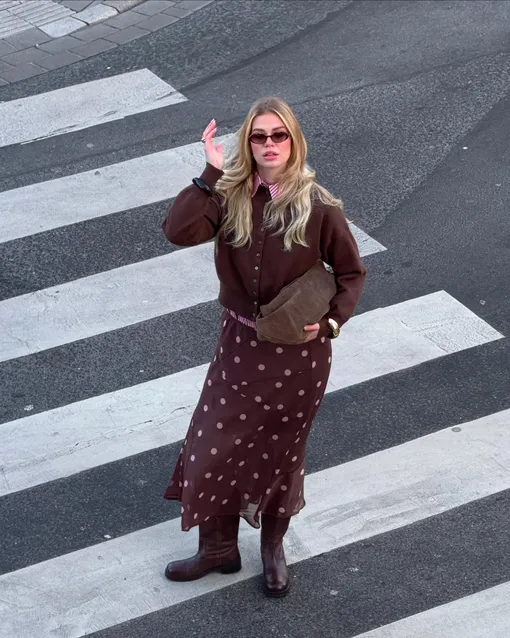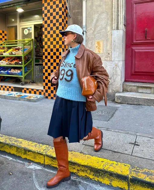 Шаг первый: открываем шкаф и достаем «ту самую» проверенную юбку до колена (да, она снова в тренде). Больше того, она настоящий мастхэв этого сезона! Дополни образ оверсайз-свитером и сумкой-таксой, пока та еще популярна. И сапогами-трубами, естественно: мы сделаем ставку на жокейские сапоги в оранжевато-коричневном. База.