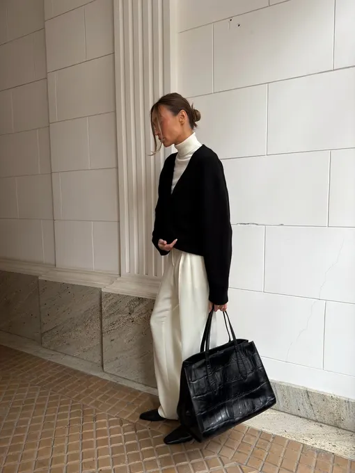 Вязаные свитера с глубоким V-образным вырезом быстро стали неофициальной униформой скандинавской стильной девушки — спортивные, чувственные и теплые, если правильно работаьь с многослойностью. Один такой базовый свитер открывает перед тобой неограниченный простор для стилизации: надевай его поверх базовой футболки, водолазки или рубашки — лук будет выглядеть продуманно, но не слишком вычурно.