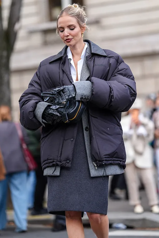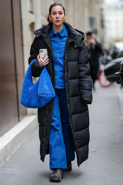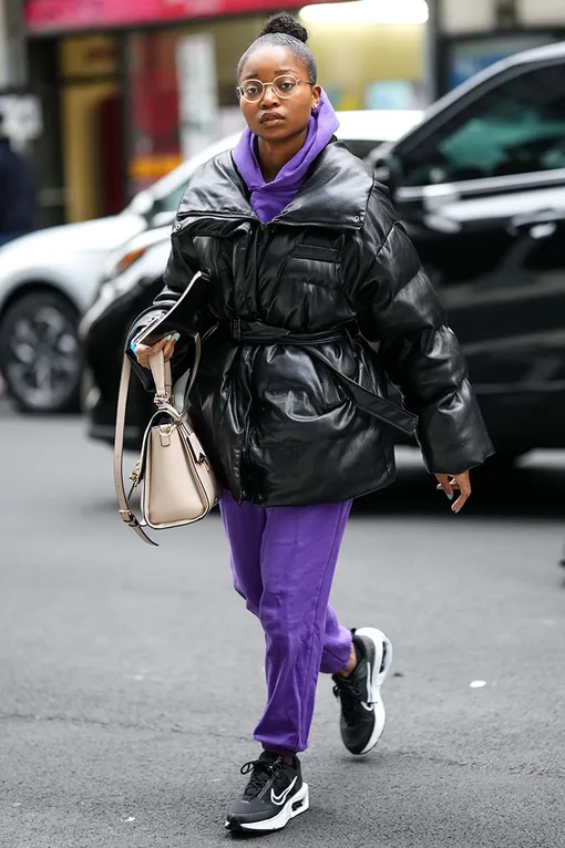 Конечно, костюм костюму рознь: куцый свитшот и обтягивающие джоггеры картинку не улучшат (и даже наоборот). Но если ты выберешь монохромный оверсайз-костюм из плотных материалов и флисовой подкладкой (все-таки зима!), то аутфиты с черным пуховиком заиграют по-новому.