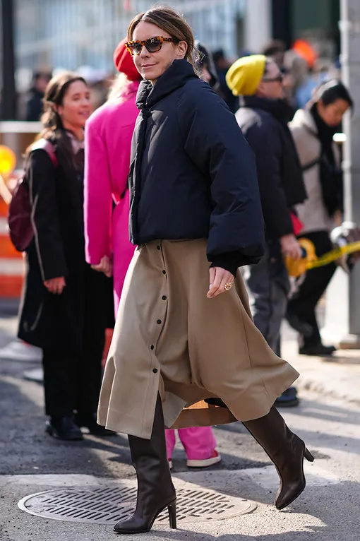 Если погода позволяет, носи пуховик с юбкой. Есть ведь шерстяные и твидовые варианты, чтобы не замерзнуть! Завершим look высокими сапогами на устойчивом каблуке – и пуховик снова не выглядит «грустно». А требовалось всего-то заменить джинсы на юбку А-силуэта!