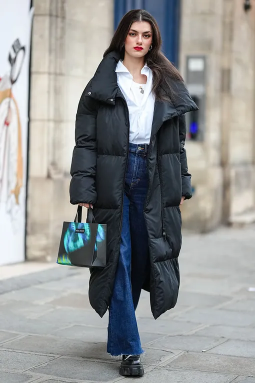 Вариация с джинсами – и с джинсовой курткой. Трюк с двойным денимом мы используем регулярно, он и правда выручает в сложных модных ситуациях. А с задачей освежить черный пуховик джинсы с джинсовкой справятся на раз-два!