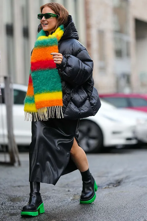 То, что яркий цветной шарф исправит аутфит в стиле семейки Аддамс, ты и без нас знаешь. А пробовала ли ты ввести в look челси на цветной подошве? Таких моделей, кстати, в последнее время мы замечаем немало. Ненавязчивый, но сочный акцент – нравится!